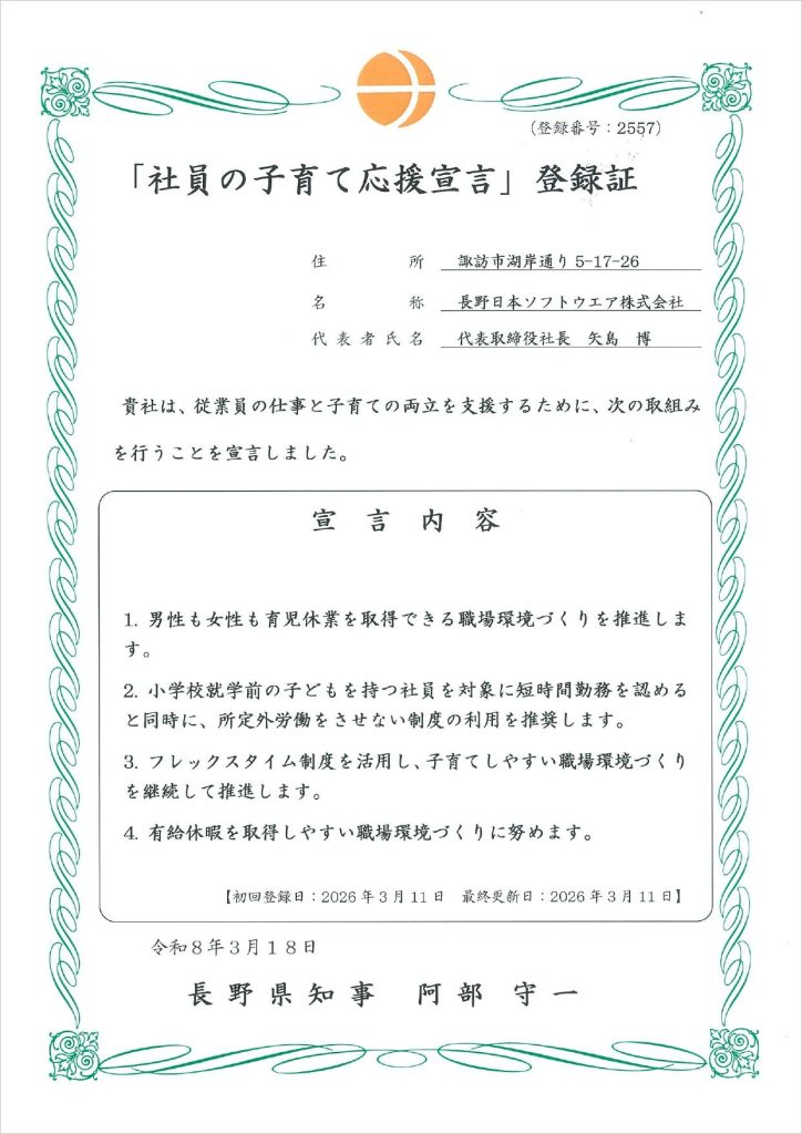 弊社では、「社員の子育て応援宣言(長野県)」をしました。